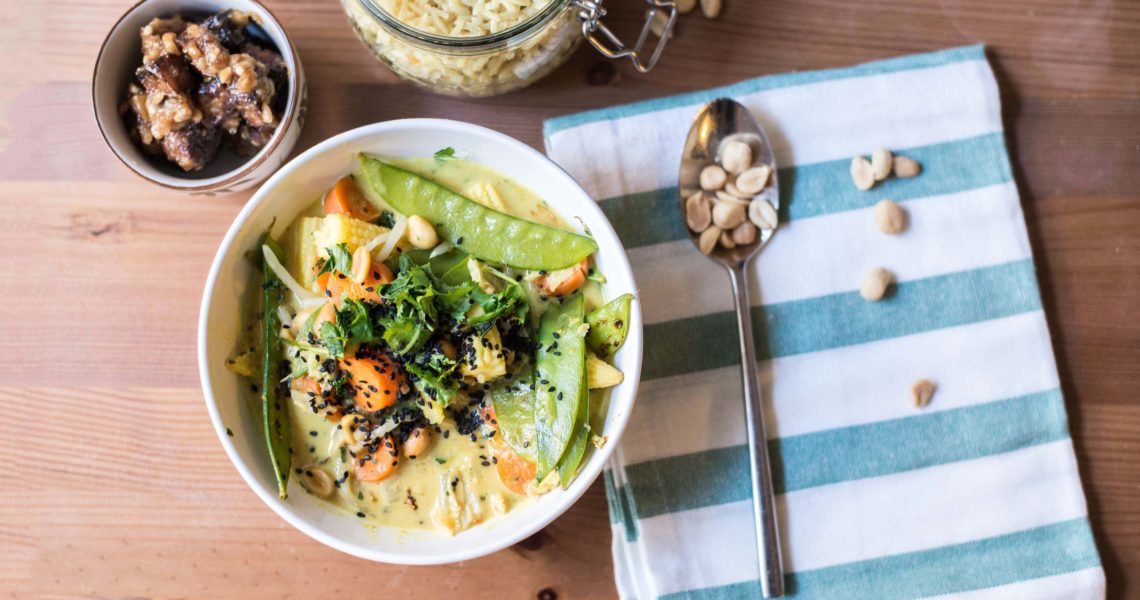 One of my favourite meals is Thai Curry. I love the taste and the mixture of some fresh vegetables and delicious-spicy coconut cream. And peanuts. Oh, I just love peanuts in all forms! This recipe is perfect for my cravings: Roasted veggies in coconut “soup” with rice and peanut butter…